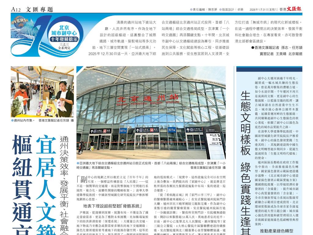 2026年是北京城市副中心规划建设十周年。《香港文汇报》就此推出“北京城市副中心十年发展启示”系列报道,并专访清华大学建筑学院教授、中国新型城镇化研究院院长尹稚,解读北京城市副中心如何发挥枢纽作用贯通京津冀,以及其对香港北部都会区建设提供的借鉴意义。
