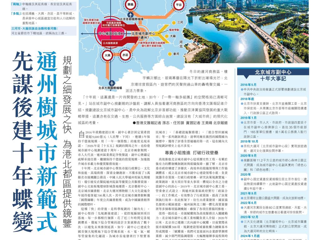 2026年是北京城市副中心规划建设十周年,在近日召开的北京市十六届人大四次会议上,《北京城市副中心条例(草案)》提请审议。《香港文汇报》就此采访了清华大学建筑学院教授、中国新型城镇化研究院院长尹稚以及多位专家,解读北京城市副中心的十年成就及“十五五”发展着力点,以期为香港北部都会区建设提供借鉴。