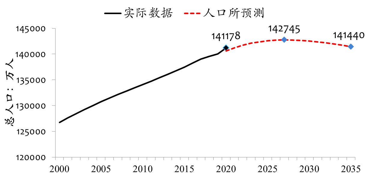 根据预测,总人口将在2027年左右达到高峰,人口规模总量达到14.2亿左右。考虑到三孩政策的出台和鼓励生育政策的实施,按照1.5的总和生育率水平进行数据预测,中国人口总量峰值将在2027年出现,总人口在14.27亿左右,此后人口持续下降,2035年降至14.14亿左右。即便数据预测中采用的总和生育率已经高于七普数据,未来总人口增长势能仍将进一步减弱。从今年最新的数据情况看,今年的人口净增长48万。这意味着从现在开始一直到2025年,增加的人口将非常有限,正不断接近零增长。