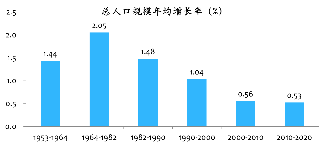七普数据显示,我国总人口为141178万人,与第六次人口普查相比增加7206万人,增长5.38%,年平均增长率为0.53%,与2000年至2010年的年平均增长率0.57%相比,下降0.04个百分点,人口增量长期趋势上是在逐步下降的。