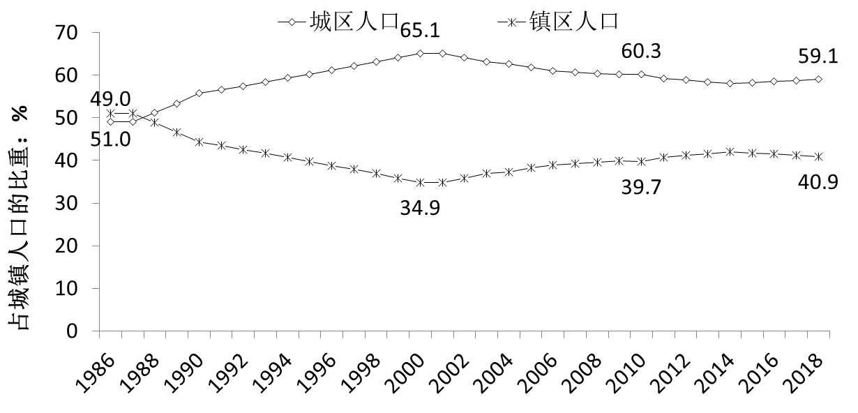 大规模城镇化集聚的阶段已经过去,今后我国的城镇化格局将逐渐稳定。城市和小城镇在中国城镇化中都发挥了重要作用,2018年城区人口和镇区人口的比例约为6:4。假定我国到2035年基本实现现代化,城乡二元结构消失,人口城乡分布均衡,人口流动基本稳定,需要进一步通过分析农村劳动生产率去预测该均衡的条件下我国的城乡比例。