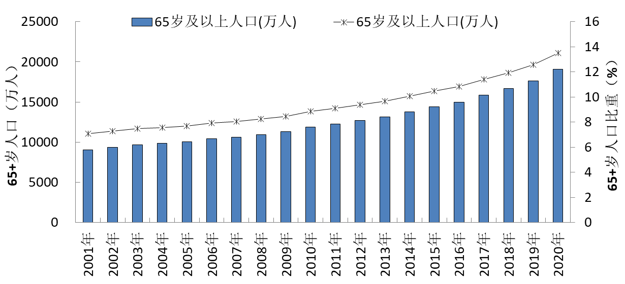 目前我国65岁及以上人口总量共1.91亿,占比为13.5%。从2010年到2020年,65岁及以上人口占比上升了4.63个百分点;与上个十年相比,上升幅度分别提高2.72个百分点。到2035年我国65岁以上老年人口占比将超过20%,从2021年到2035年每年大约提高0.5个百分点。