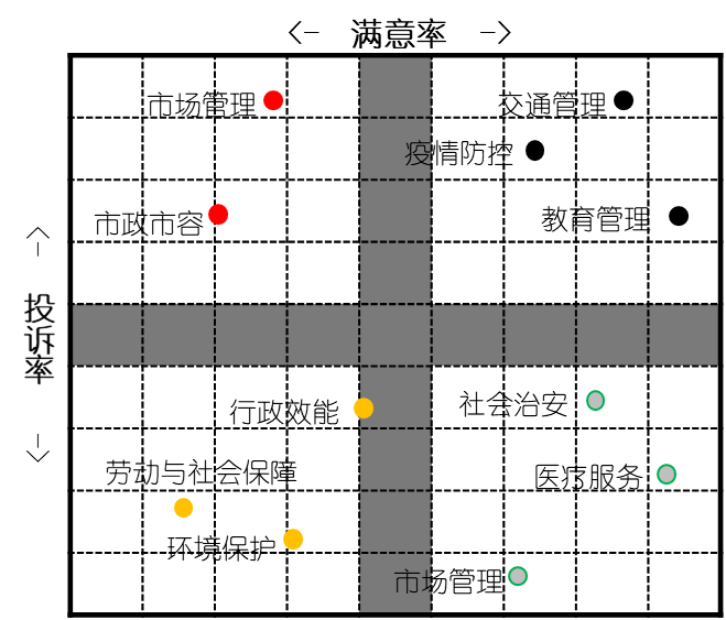 在城市治理过程当中,人感数据与物感数据相吻合是数据转化落地施行的关键,有利于构建一个“全感知”城市。一方面,可以通过叠加12345政府服务热线所反映的问题与属地政府进行交叉定位,并对属地政府的治理绩效进行排位与分类,对满意率、解决率低的属地政府进行重点投入和重点监督。另一方面,可以把不同类型的问题按照满意率、投诉率进行交叉排布,关注高频问题背后的共性问题,包括长期高频问题背后的民生痛点难点、以及突增高频问题背后的风险隐患点等。