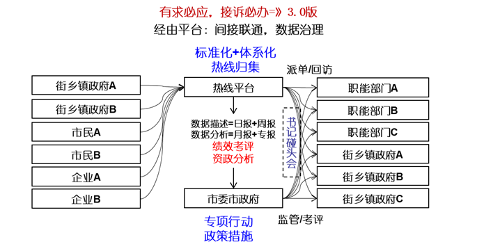总体来看,接诉即办经历了“有事投诉、有求必应”的1.0版、“街乡吹哨、部门报道”的2.0版,再到现在的“有求必应,接诉必办”3.0版以及现在的“主动治理,未诉先办”这样几个发展阶段。1.0时期相对较为散乱,多个部门多条热线,缺乏数据的汇总与沉淀,且无法对诉求的解决情况加以监督。为了解决这一问题,2.0版发展成市民诉求转移到政府、从属地政府再转到职能部门的模式。后来又在这一基础上,进一步发展出集成式平台,形成了3.0版本,所有市民、企业的投诉电话统一接到热线平台,热线平台通过派单的方式分配到各个职能部门或属地政府,并可以通过回访的方式加以管控监督。在此过程中,数据得以汇总沉淀,奠定了后续开展评估的基础。
