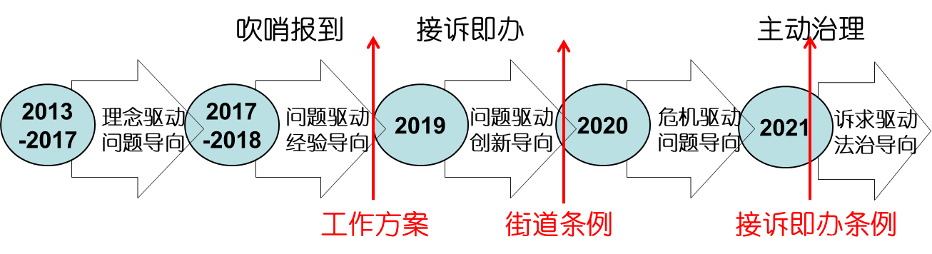 回顾接诉即办工作的实践发展历程,接诉即办改革从“看得见的做不到,做得到的看不见”,到2017年提出“街乡吹哨、部门报道”,努力解决条块分割行政体制下的矛盾;2019年,“吹哨报道”进一步发展延伸,从经验导向转向了创新导向;2020年疫情发生以后,在城市相对封闭的情况下,电话热线的作用进一步凸显,数字化政务手段的普及与丰富也带来了大量的后台数据,促进了“接诉即办”向“主动治理”转变,推动了接诉即办工作逐渐走向诉求驱动、法治导向。
