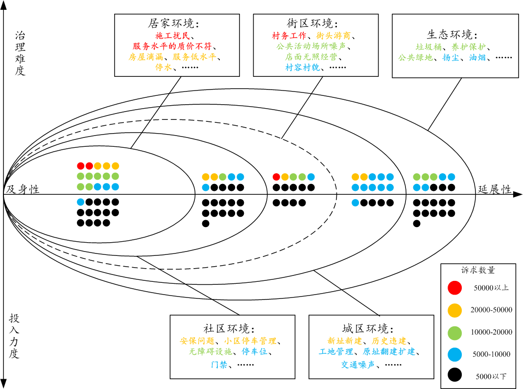 在数据分析过程中,我们也发现了一些有意思的结论。一是人居环境方面,老百姓对自己的家居环境最为关注,其次才是小区环境,然后是街区环境,最后才是市区环境和外部生态环境。由此可见,政府的宣传引导工作也应当进一步与百姓关注的重点空间相结合,以确保宣贯效果。二是民生问题方面,低收入群体、收入不稳定群体、弱势群体和脆弱群体等更依赖于基础民生服务,因此针对不同群体的诉求需要进一步细分为基础民生、基本民生、优化民生、优质民生,帮助政府更具有针对性地回应民众关切问题。