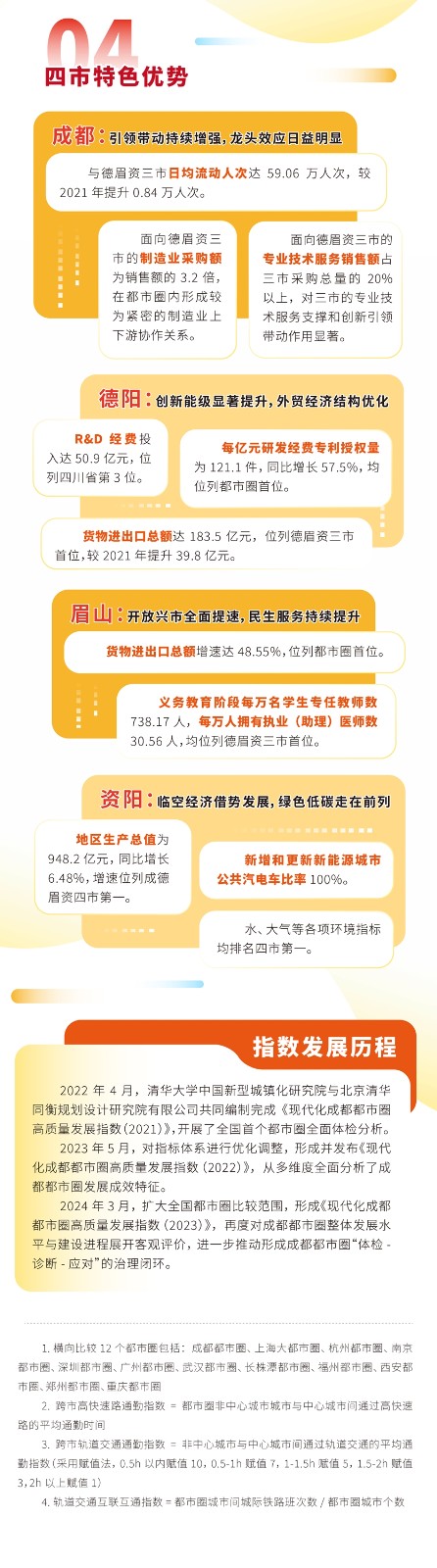 2024年4月2日,清华大学中国新型城镇化研究院和北京清华同衡规划设计研究院有限公司联合发布《现代化成都都市圈高质量发展指数(2023)》。与上一年度相比,本次都市圈横向比较范围进一步扩大至12个主要都市圈,成都都市圈自身建设进程评估覆盖整个起步期。结果显示,成德眉资同城化进程不断提速,成都都市圈三年起步期建设成效初显,交出了稳中向好的阶段性答卷。