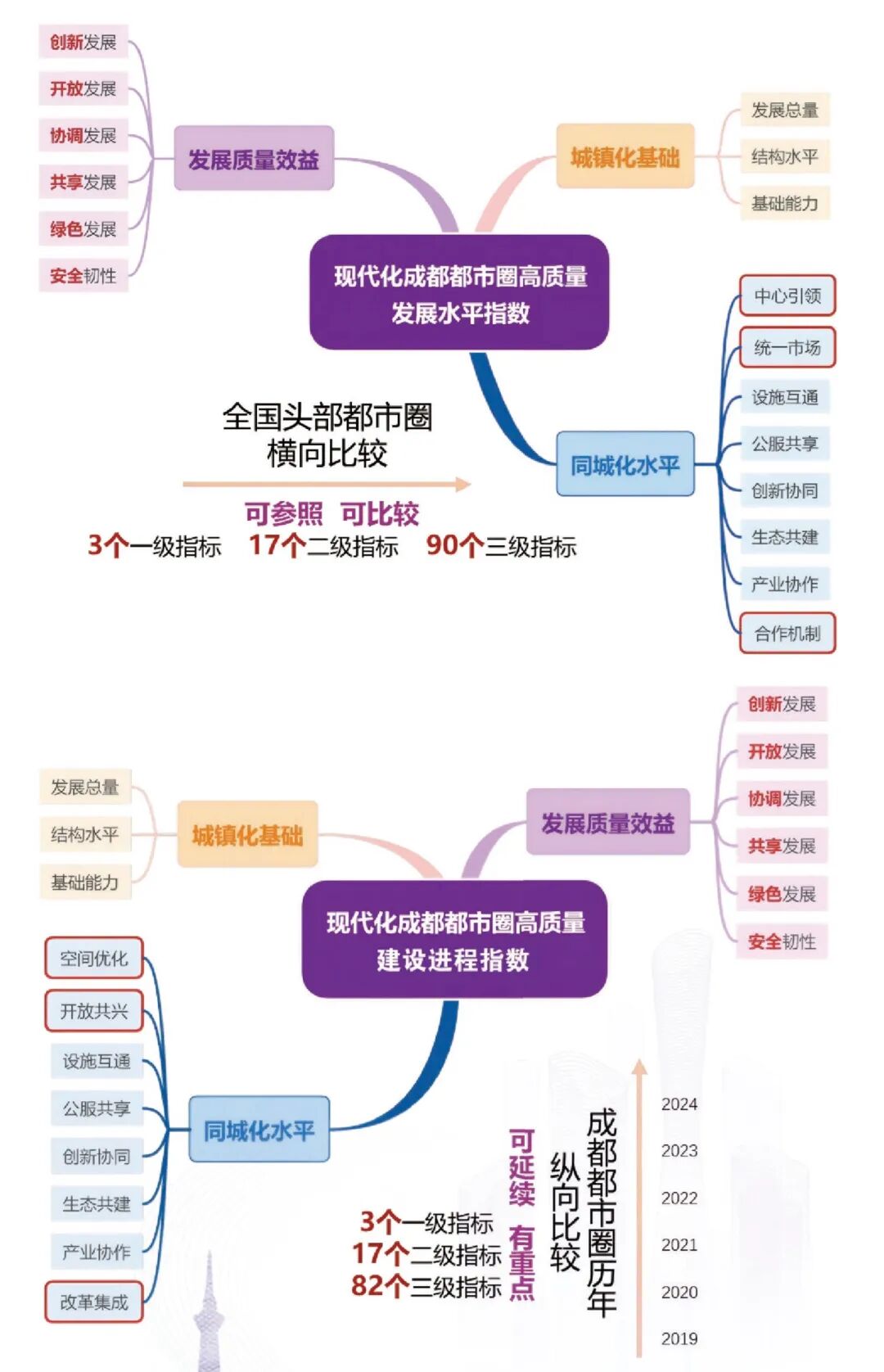 据悉,该指数由四川省同城化办公室联合国家级智库构建,以成都都市圈为样板形成地方层面首个都市圈发展综合评价指标体系。体系围绕“城镇化+高质量+同城化”核心板块,建立横向对外评价的“发展水平指数”与纵向对内监测的“建设进程指数”两套纵横对比体系,今年更重点优化指标口径统一性并增补要素流动网络评估相关流量性指标,为都市圈“十五五”规划提供重要参考。