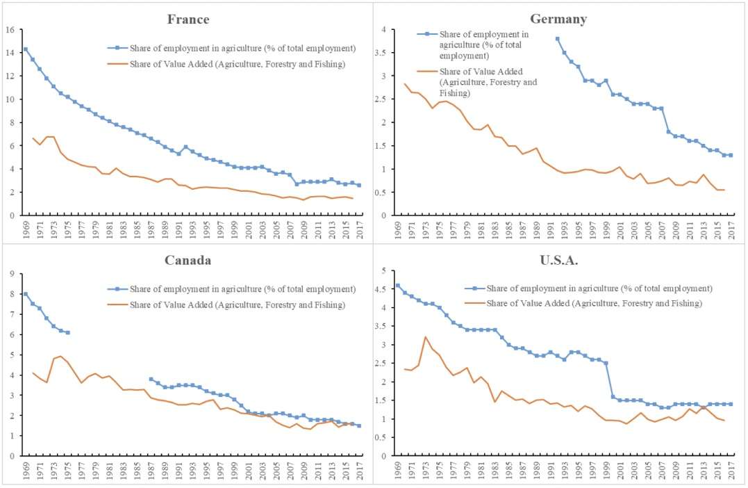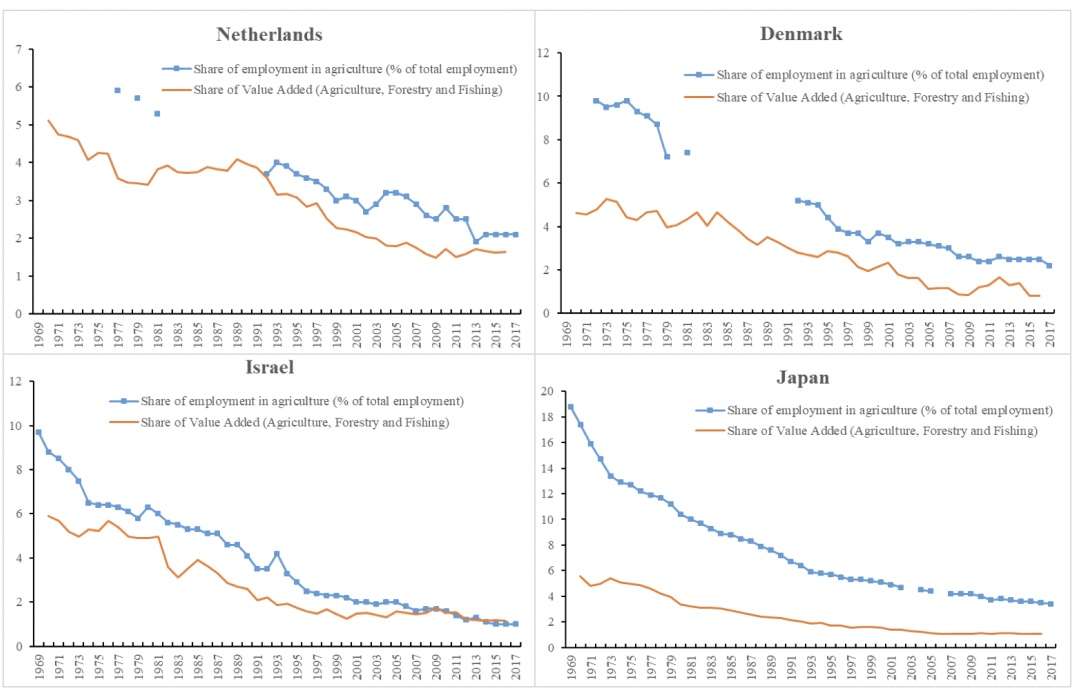 在上一轮的城市化化进程中,中国经历了快速的城市化阶段,中国的农业出现重大的反弹现象。第一是在整个城市化进程中,农业的两个指标应该是同时下降的。大家看到这里荷兰、丹麦和日本,这些都是在城市化进程中农业非常强的国家,也出现了两个方面的同时下降,农业占GDP的份额和农业占就业份额的同时下降。另外就是老牌的法国、德国、美国和加拿大都是同时下降,这两个同时下降的问题在我们讨论城市化的时候不够重视。
