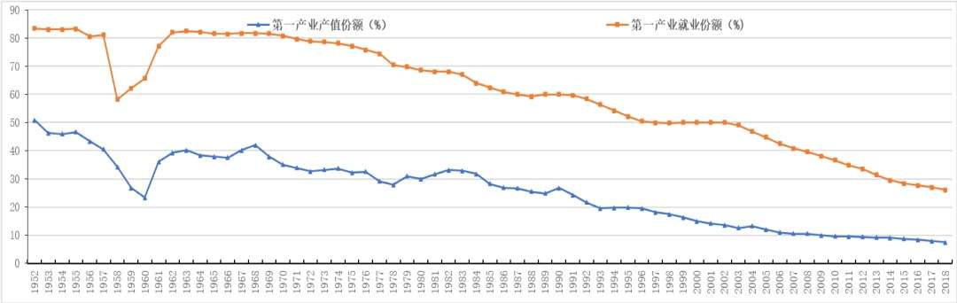 第一个反常是这两个份额的下降不一致,农业占GDP的份额和国际趋同,差不多6%左右。但是我们的就业份额还占到将近30%,而且这30%里面还有很多问题,这是第一个反常现象。