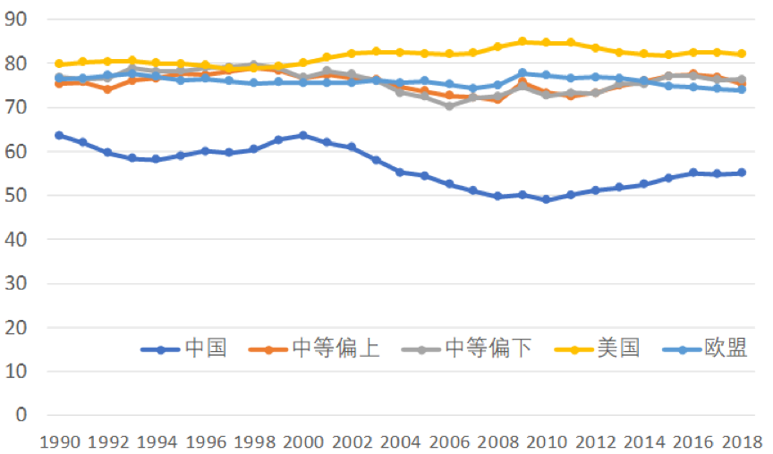 接下来我们做一个国际比较。消费率这个指标是最终消费需求占GDP的比重,从世界银行提供的数据来看,中国的消费率有两个特点:一是消费率低于世界上其他主要经济体,进行比较的包括我们所处的分组行列的中等偏上收入国家、收入水平低于我国的中等偏下收入国家,以及美国和欧盟这些主要发达经济体,这些经济体的消费率比我们都要高很多。