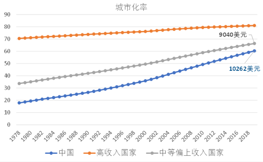 中国居民收入增长要保持与GDP增长同步,很重要的一个途径是推动新型城镇化。在过去40多年,中国实现了全世界史无前例的快速城镇化。尽管赶超的速度非常快,但是,一方面肯定还没有赶上发达国家。高收入国家平均城镇化率是84%,我们只有60.6%。另一方面也还没有赶上中等偏上收入国家的平均水平。我们在中等偏上收入国家中人均GDP属于平均水平之上,2019年我们人均GDP超过1万美元,这个收入组的平均水平是9000美元,但是,我国的城镇化率却比中等偏上收入国家平均水平低6个百分点。预计在“十四五”时期,我们可以跨越高收入国家的门槛,即12000美元,因此,这个城镇化差距我们要迅速弥补。
