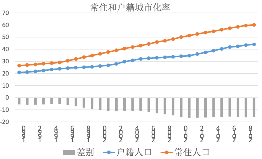除了这个潜力之外,还有一个很重要的城镇化潜力是中国特有的“常住人口城镇化率”与“户籍人口城镇化率”之间的差距。统计局定义一个人在一个地方居住6个月及以上就属于这个地方的常住人口,那么在城镇地区居住6个月及以上的人口就是城镇常住人口,也就被统计到常住人口城镇化率指标中。统计局还有一个定义叫“外出农民工”,即离开本乡镇6个月及以上的农村劳动力。农民工离开本乡镇后大部分都进城了。可见,农民工属于“被城镇化”的人口群体。从图中可见,两个城镇化指标之间有16个百分点的差异。