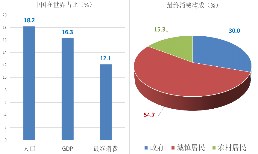 中国人口占世界人口18.2%,GDP按照官方汇率计算已占世界的16.3%,但最终消费只占世界的12.1%。如我们的GDP比重和消费比重能达到一致,就还有4个百分点的潜力可以挖掘,产生的消费总规模相当于英国的全国数量,将对中国经济有非常显著的拉动作用。最终消费中30%是政府消费,70%是居民消费。居民消费部分更有潜力。中国目前城镇化率60.6%,就是说还有40%的人生活在农村,但他们在居民消费中只占22%。农村居民消费将是未来拉动中国经济最大的潜力。
