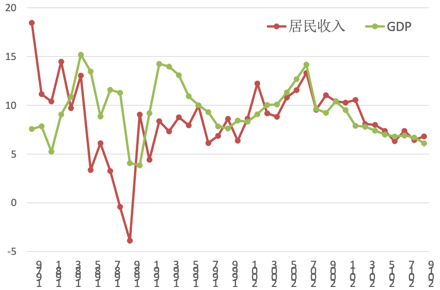 挖掘潜力的最大挑战是让居民收入与经济同步增长。把居民收入增长率和GDP的增长率进行比较,整体趋势是同步的,不同时期不尽相同。20世纪80年代中到90年代末,GDP的增长超前于居民收入增长,劳动收入占比很低,意味着这个时期我们注重了做大蛋糕,但是蛋糕没有完全、合理地分配好。党的十八大以来,居民可支配收入的增长速度明显超过了GDP增长,其中农村居民收入比城市居民收入增长还要快一些,这确保了我们每年能有1300多万农村人口脱贫,预计今年将实现全部农村人口脱贫。