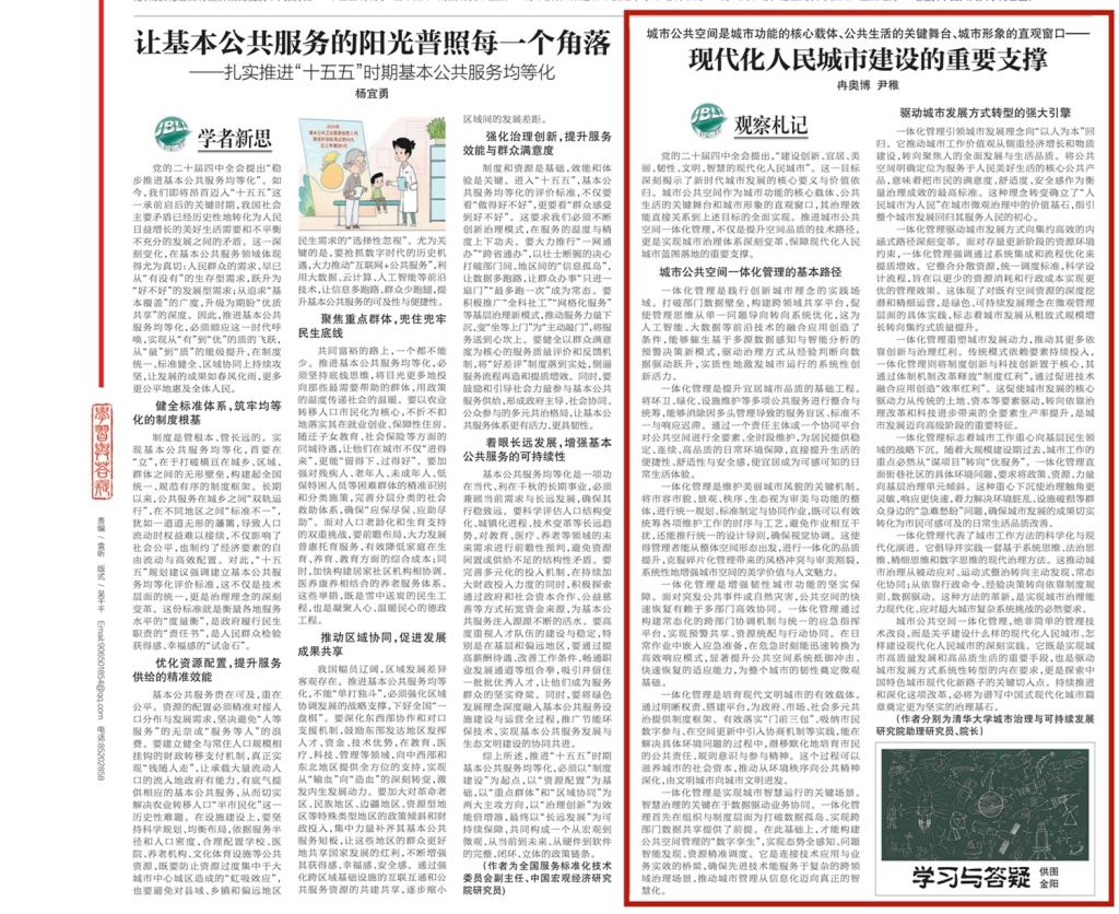 2025年12月29日,清华大学中国新型城镇化研究院助理研究员冉奥博、院长尹稚,在《北京日报》理论版发表署名文章《现代化人民城市建设的重要支撑》,提出“城市公共空间是城市功能的核心载体、公共生活的关键舞台、城市形象的直观窗口”,城市公共空间一体化管理是“现代化人民城市建设的重要支撑”。