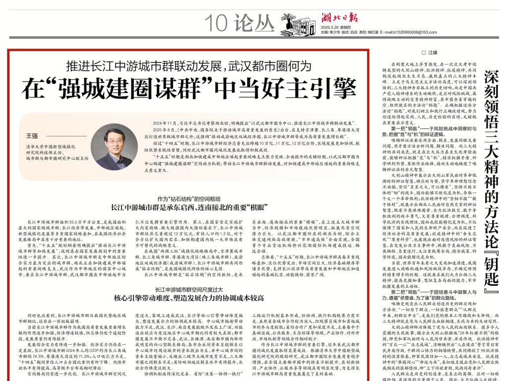 3月26日,清华大学中国新型城镇化研究院科技部主任王强,在《湖北日报》发表署名理论文章,深入解读推进长江中游城市群联动发展,武汉都市圈如何在“强城建圈谋群”中当好主引擎。