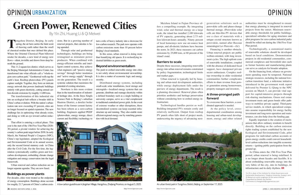 近日,清华大学城市治理与可持续发展研究院尹稚、黄莉、齐美薇,在最新一期《北京周报(BEIJING REVIEW)》发表署名文章,权威解读推动可再生能源与城市更新融合发展的价值、现状与对策建议。