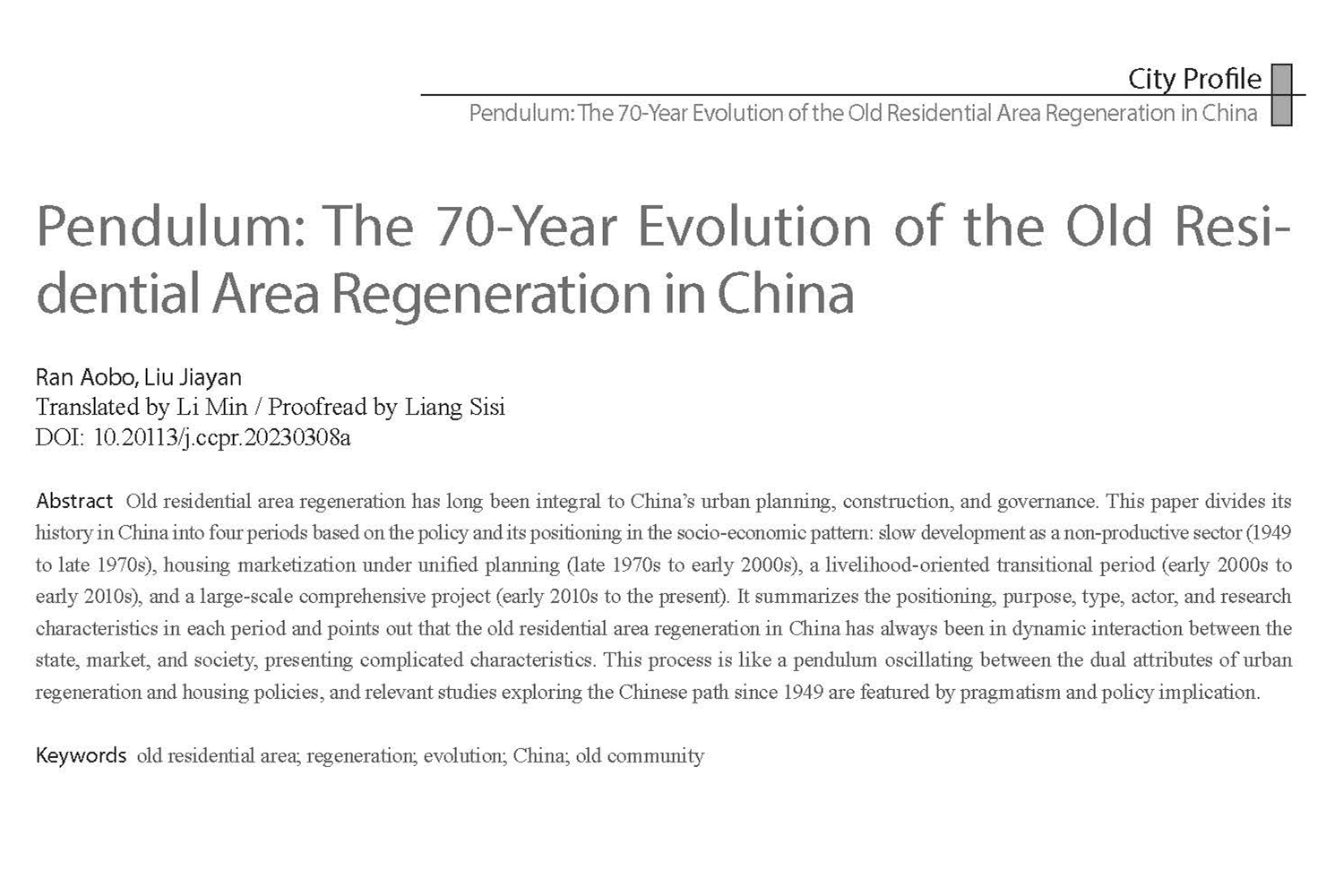 近日,清华大学中国新型城镇化研究院助理研究员冉奥博、清华大学建筑学院副教授刘佳燕,在《CCPR城市规划英文版》发表的学术文章《钟摆:中国旧住区改造的70年演进历程》。该文回顾了新中国七十余年旧住区改造的发展历程,为开展各类社区相关研究实践工作奠定了理论基础。
