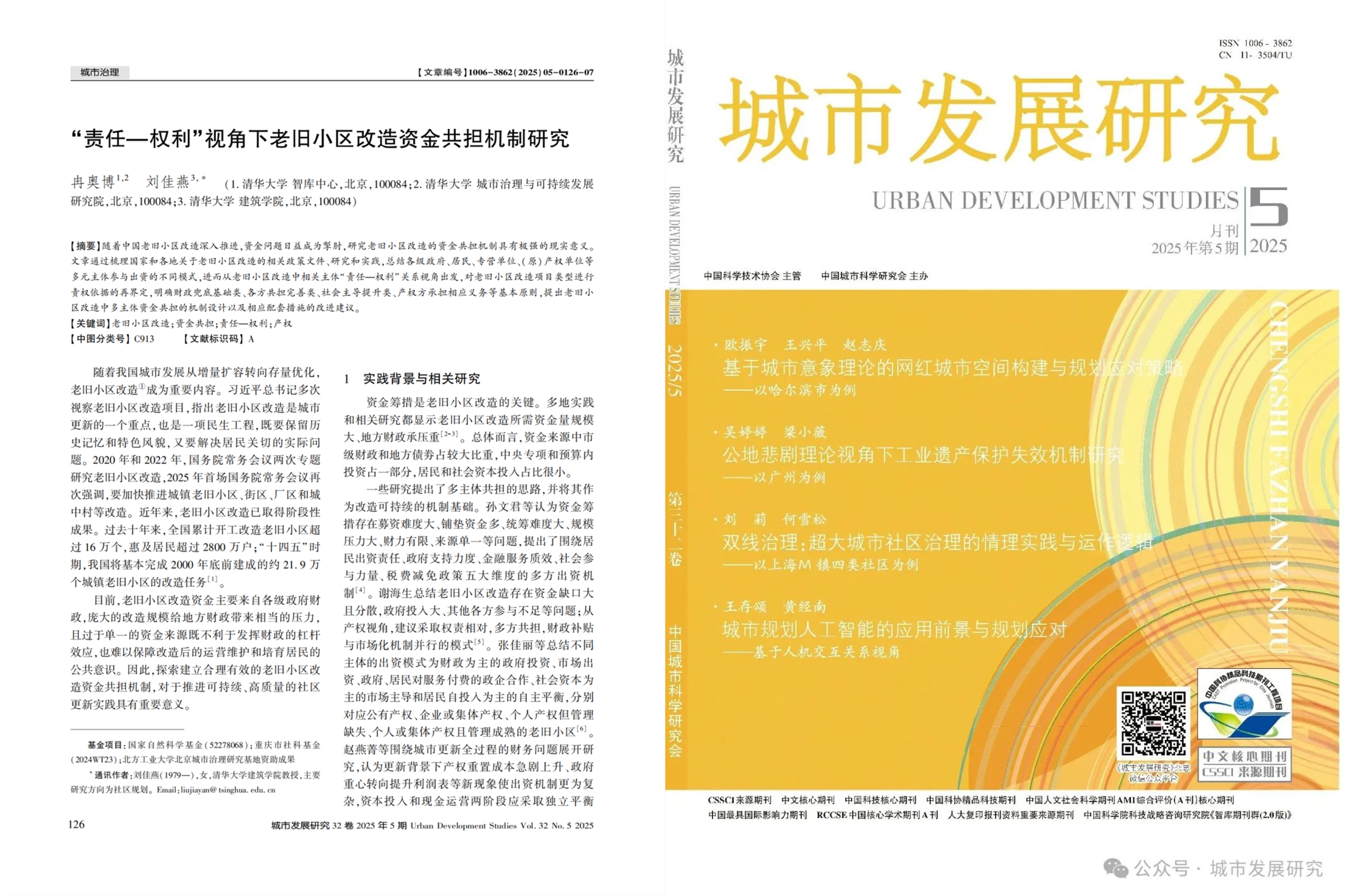 近日,清华大学中国新型城镇化研究院助理研究员冉奥博、清华大学建筑学院教授刘佳燕(通讯作者),在《城市发展研究杂志》发表学术论文《“责任—权利”视角下老旧小区改造资金共担机制研究》。