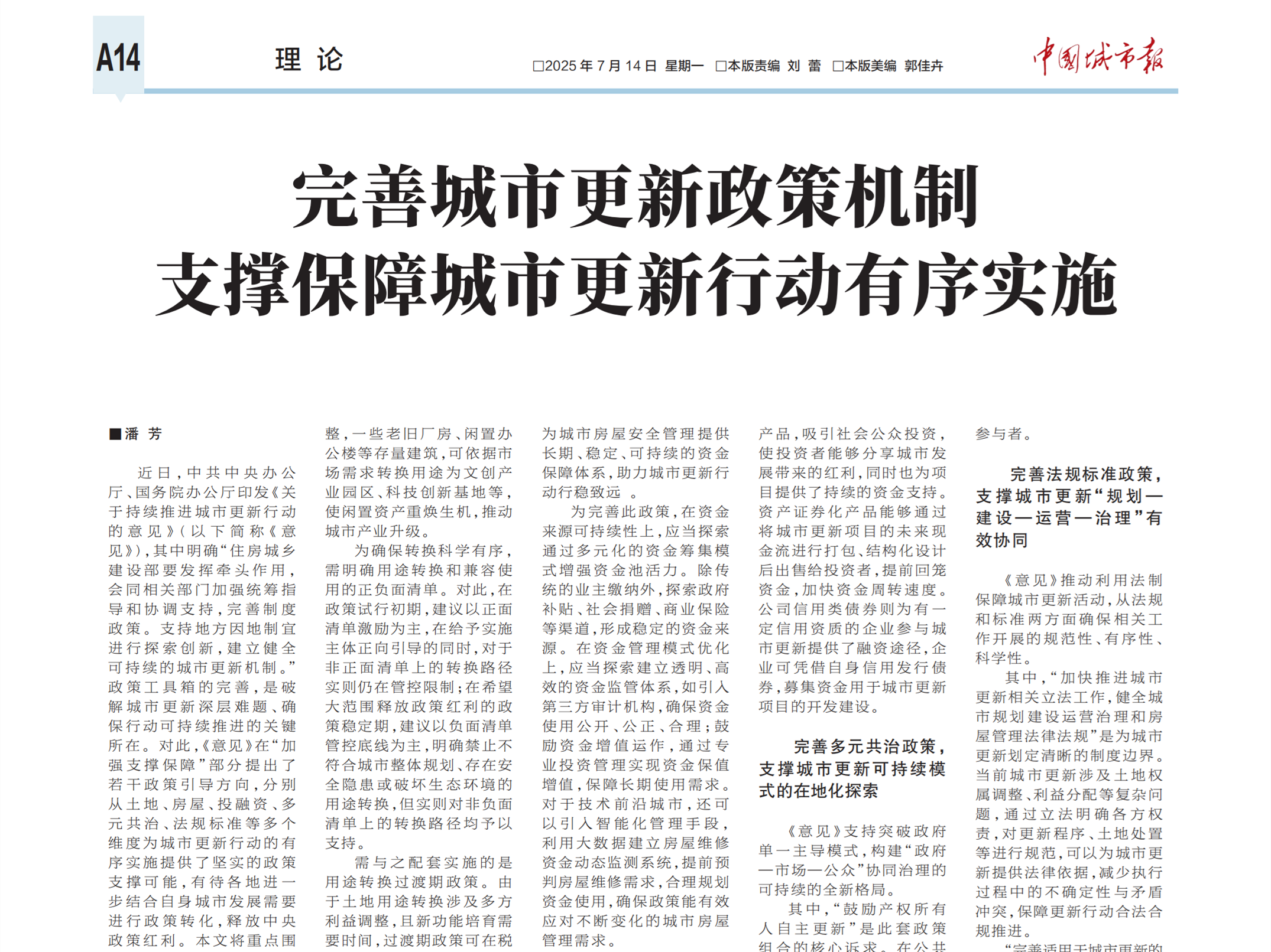 近日,清华同衡规划设计研究院党总支副书记、副院长潘芳,在《中国城市报》发表署名理论文章《完善城市更新政策机制 支撑保障城市更新行动有序实施》。