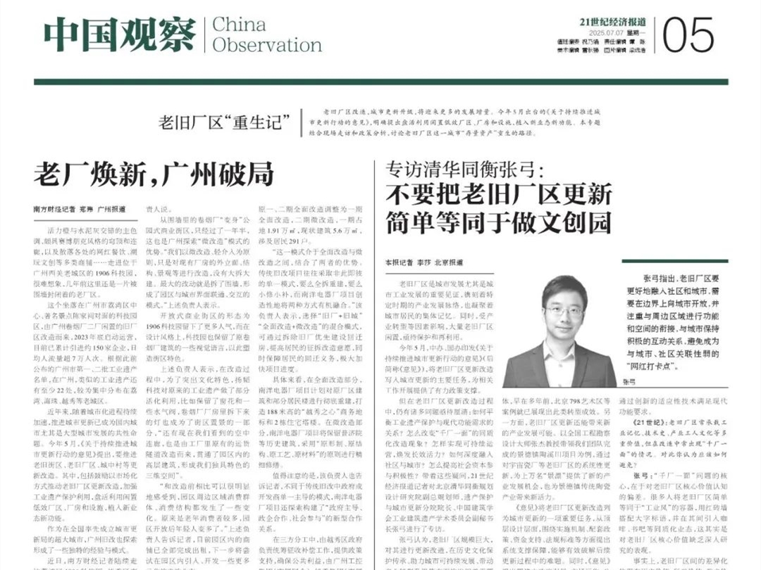 近日,《21世纪经济报道》围绕“推进老旧厂区更新改造”议题,专访了清华同衡规划设计研究院副总规划师、遗产保护与城市更新分院院长、中国建筑学会工业建筑遗产学术委员会副秘书长张弓。