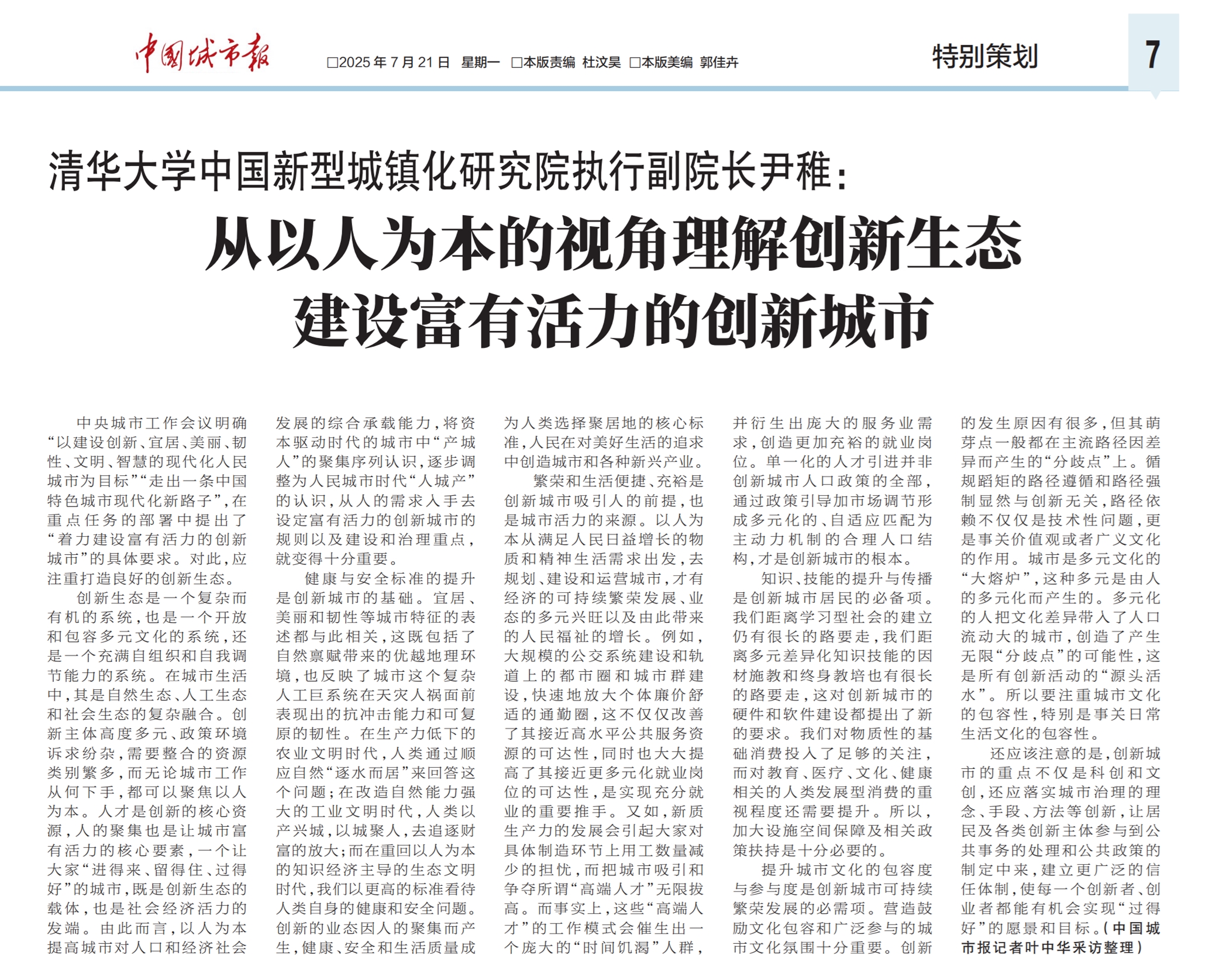 7月14日至15日,中央城市工作会议在北京举行。《中国城市报》就此组织多位专家学者展开专业化解读。本文为清华大学中国新型城镇化研究院执行副院长尹稚教授署名文章《从以人为本的视角理解创新生态 建设富有活力的创新城市》。