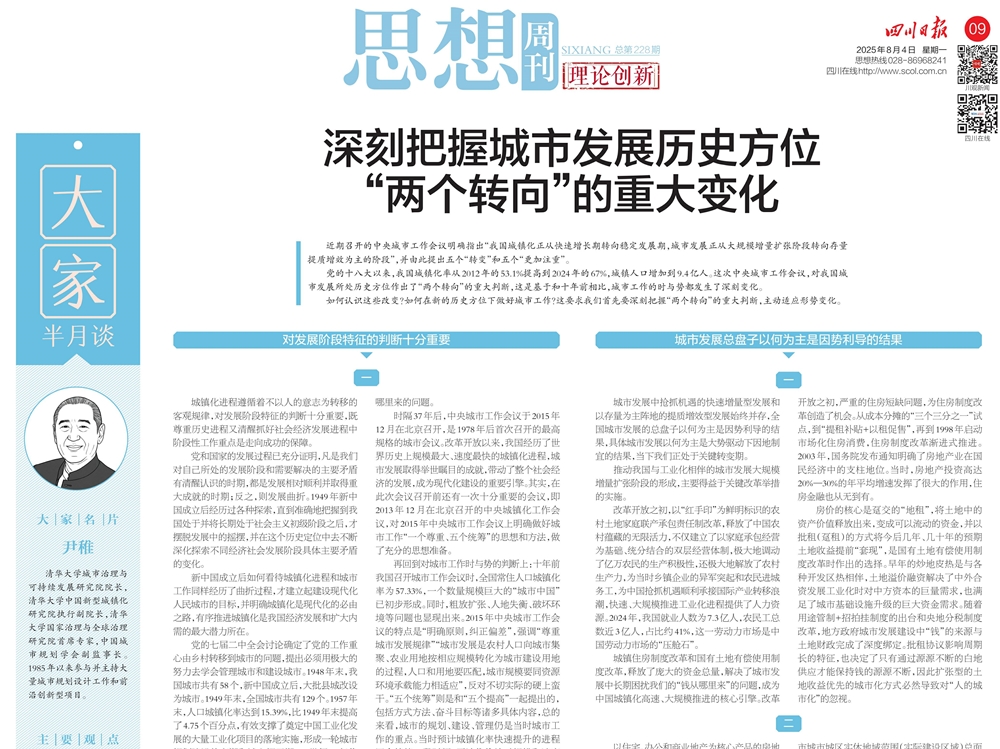 8月4日,清华大学中国新型城镇化研究院执行副院长尹稚教授在《四川日报》发表整版署名理论文章《深刻把握城市发展历史方位“两个转向”的重大变化》。