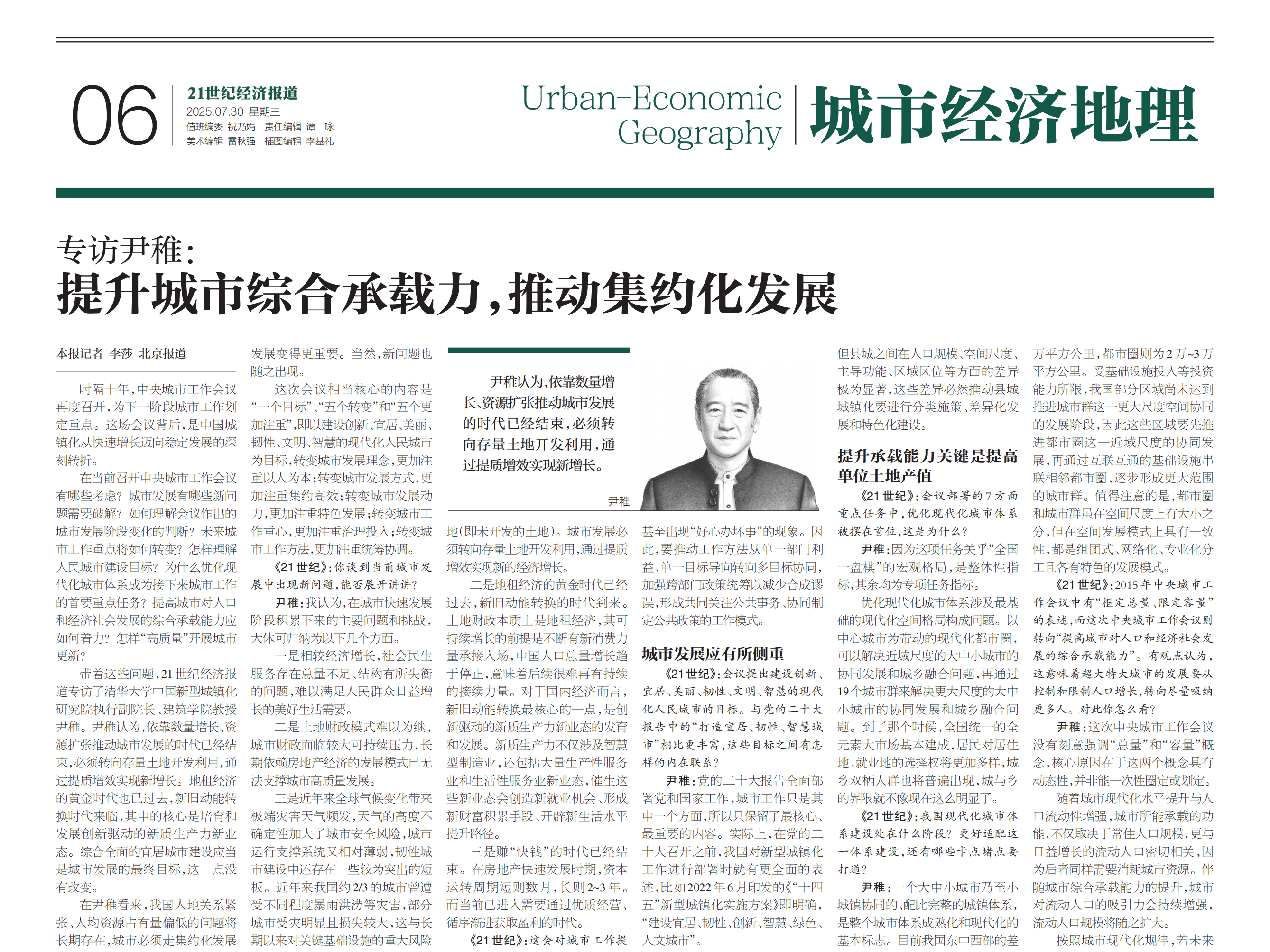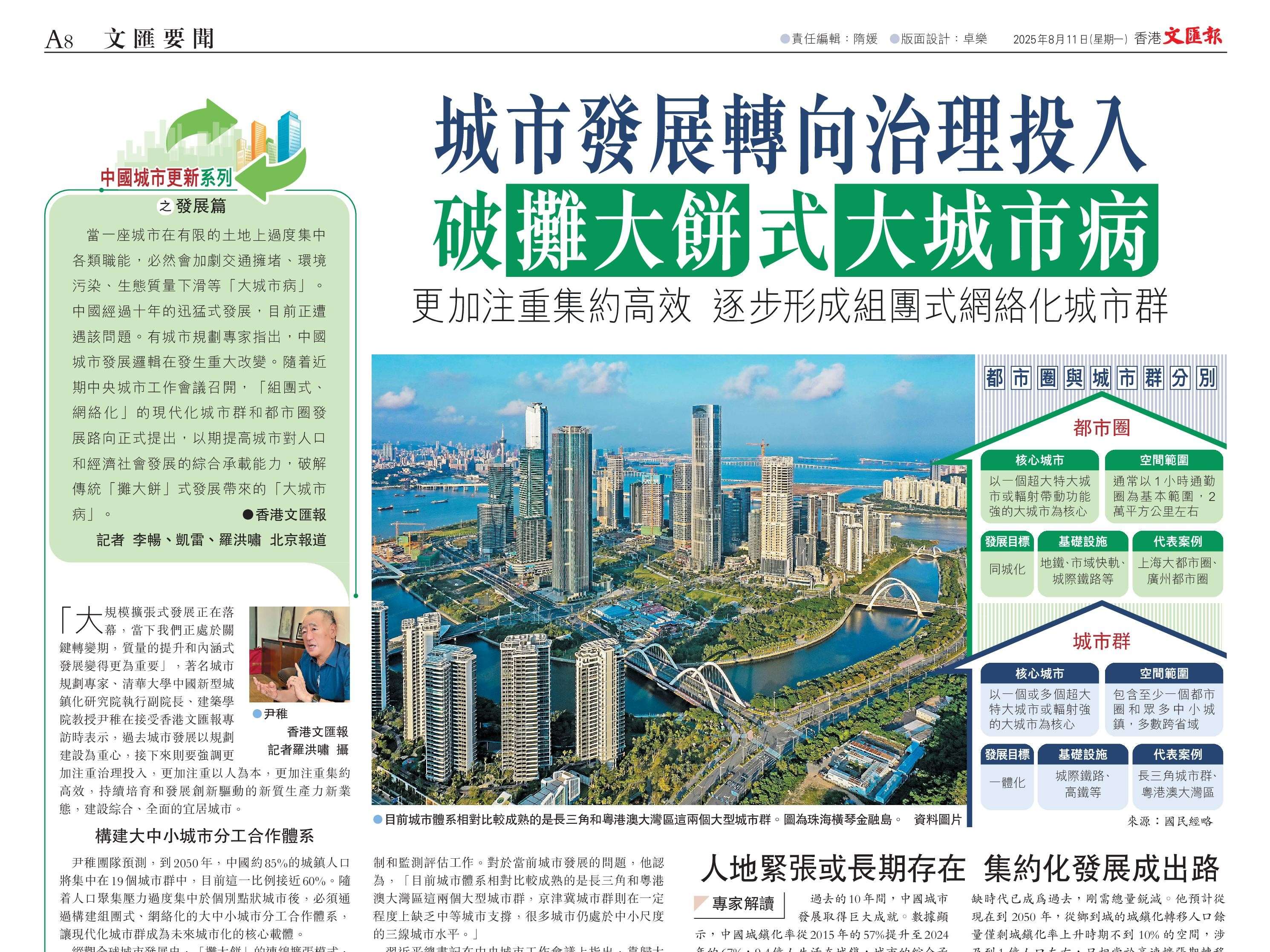 近日,香港文汇报专访清华大学中国新型城镇化研究院执行副院长尹稚教授,围绕“转变城市发展方式,更加注重集约高效”“发展组团式、网络化的现代化城市群和都市圈”等议题,展开专业化解读。