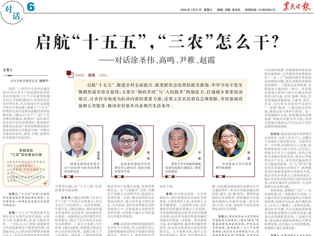 “十五五”规划《建议》中关于“三农”工作有哪些新提法、新要求?如何落实农业农村优先发展要求,推动城乡要素双向流动?如何统筹推进农村基础设施和公共服务升级?近日,《农民日报》对话栏目邀请涂圣伟、高鸣、尹稚、赵霞四位专家展开交流讨论。