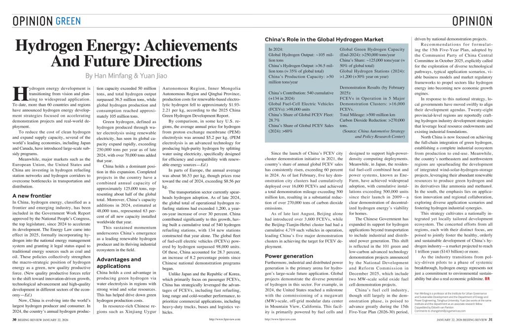 “十五五”规划《建议》提出“前瞻布局未来产业”,将氢能列为新的经济增长点。近日,清华大学城市治理与可持续发展研究院特聘专家韩敏芳、袁娇,在《北京周报(BEIJING REVIEW)》发表署名文章,权威解读我国氢能产业发展成就及未来方向。