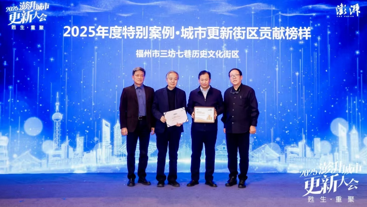 近日,“2025澎湃城市更新大会”在上海成功举办。清华大学建筑学院教授、清华大学中国新型城镇化研究院专家顾问委员会专家委员张杰主持的福州市三坊七巷历史文化街区荣获大会“2025年度特别案例·城市更新街区贡献榜样”奖。